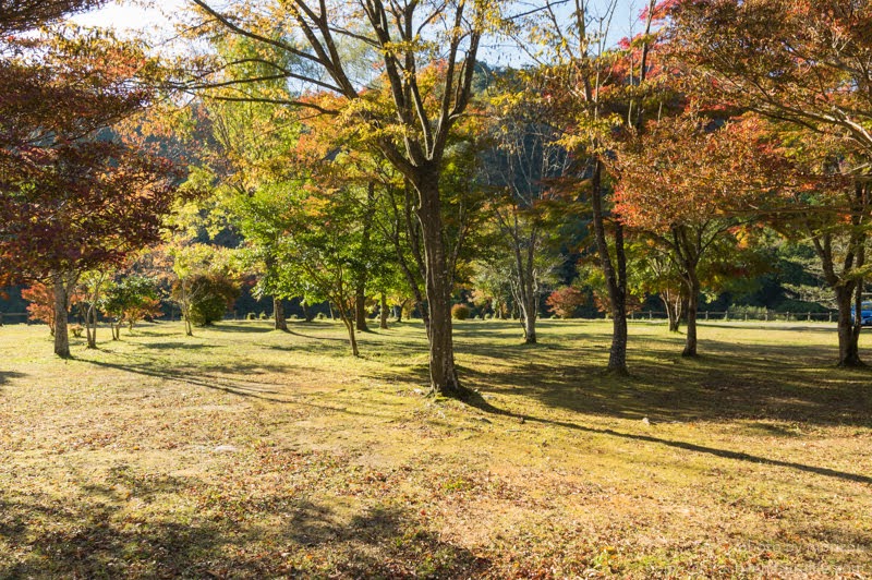 東古屋キャンプ場の中央一帯は、適度な間隔で木気が点在している平坦な草地になっています。