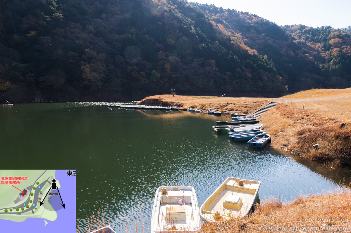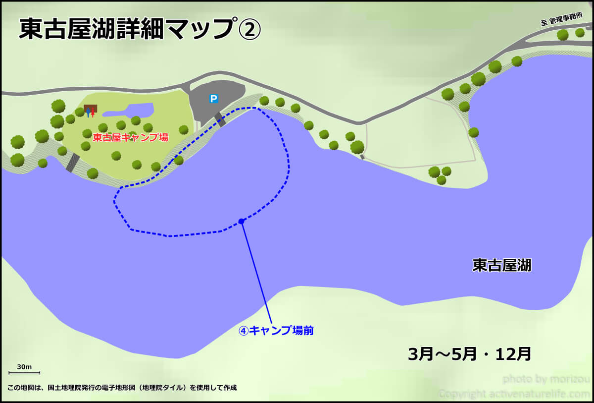 こちらに東古屋湖の詳細マップを載せておきます。